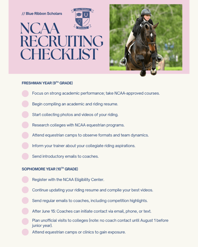 - Focus on academics and NCAA-approved courses; begin building an academic/riding resume.
